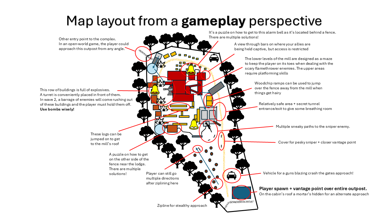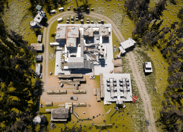 designed to be approached from multiple angles and with multiple play styles supported. Whether it’s mindlessly storming the front gate on your ATV or carefully sneaking your way in through various paths, this map supports it all. Besides the versatile gameplay I put equal effort into selling the lumber mill theme by applying research and references into making it look like an actual lumber mill that could actually operate.