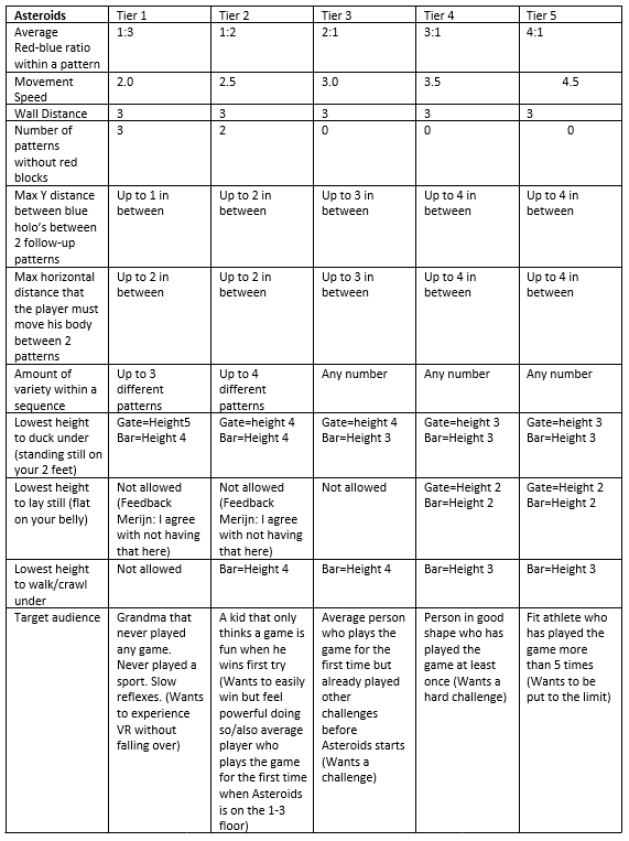 On the right you can see a difficulty matrix sheet I made for the challenge called ‘Asteroids’. When working on a challenge I always make sure to identify all factors that influence difficulty so I can easily tweak the overall difficulty by adjusting different aspects.