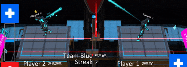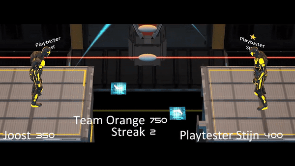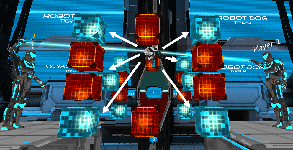 Note that I ended up changing the direction the Holos spawn from to increase visual clarity for the contesters. Play-testing showed that some players found seeing the other players’ Holos was distracting whilst looking at the nearest laser arms helped improve their timing.